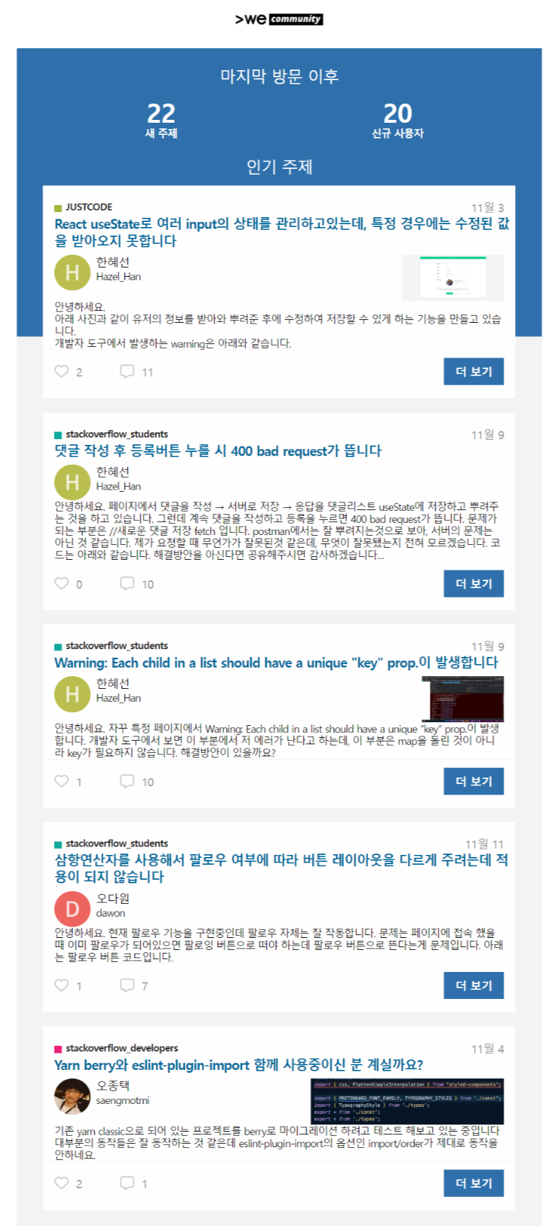 + 어느날, 우리 팀원 중 한 분이 나에게 메일을 보내주셨는데, 인기질문 top 5 중 내 질문이 3개나 들어있다고 하셨다. 뿌듯함이 밀려왔다.